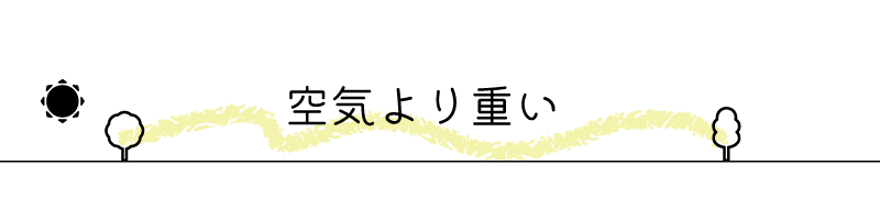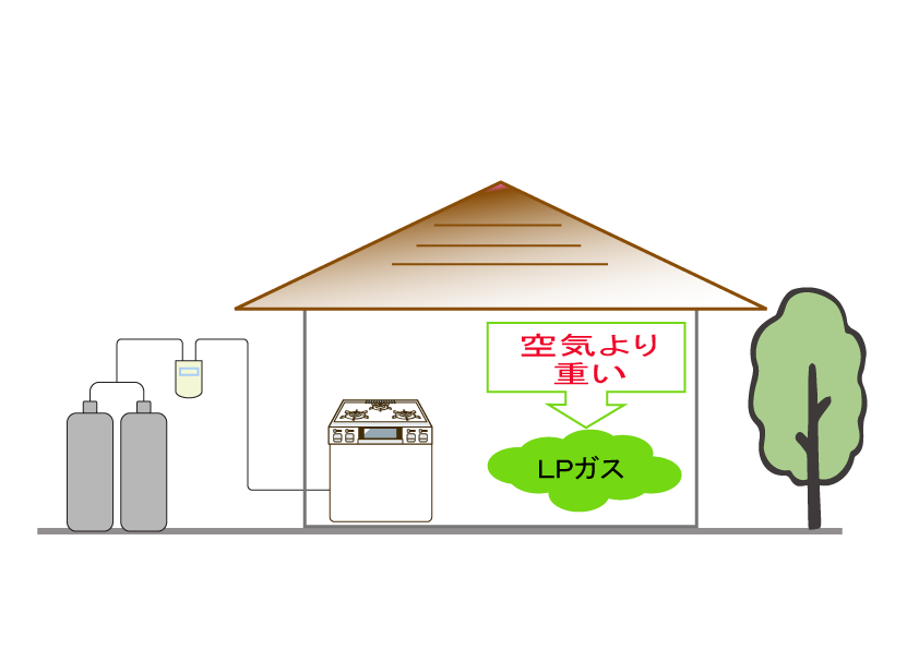 LPガスは空気の約1.5倍の重さがあり、もれると低いところや物かげにたまる性質があります。